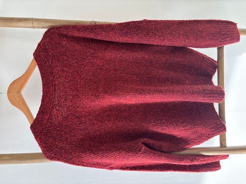 Pull rouge en laine avec plusieurs boutons différents de fleurs